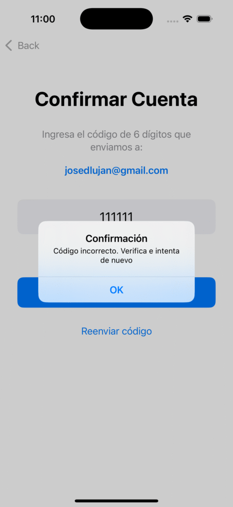 Errores posibles: – Si ingresas código incorrecto: “Código incorrecto. Verifica e intenta de nuevo” – Si el código expiró: “El código ha expirado. Solicita uno nuevo”